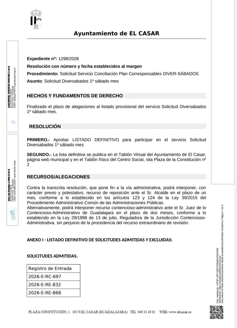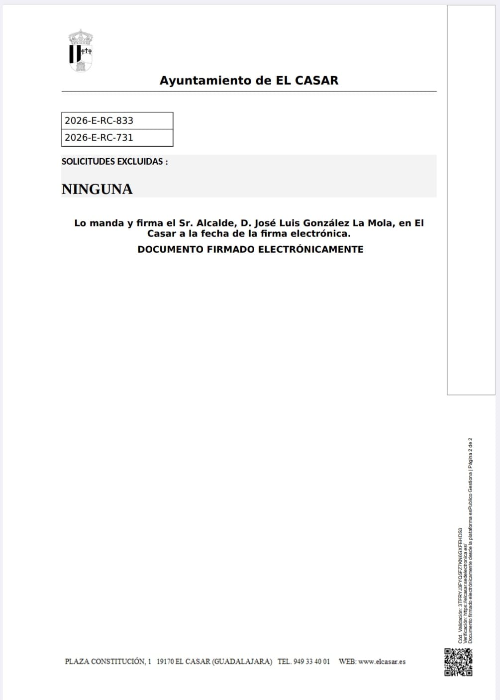 La lista se publica en el Tablón Virtual del Ayuntamiento de El Casar, página web municipal y en el Tablón físico del Centro Social (Plaza de la Constitución nº 2).