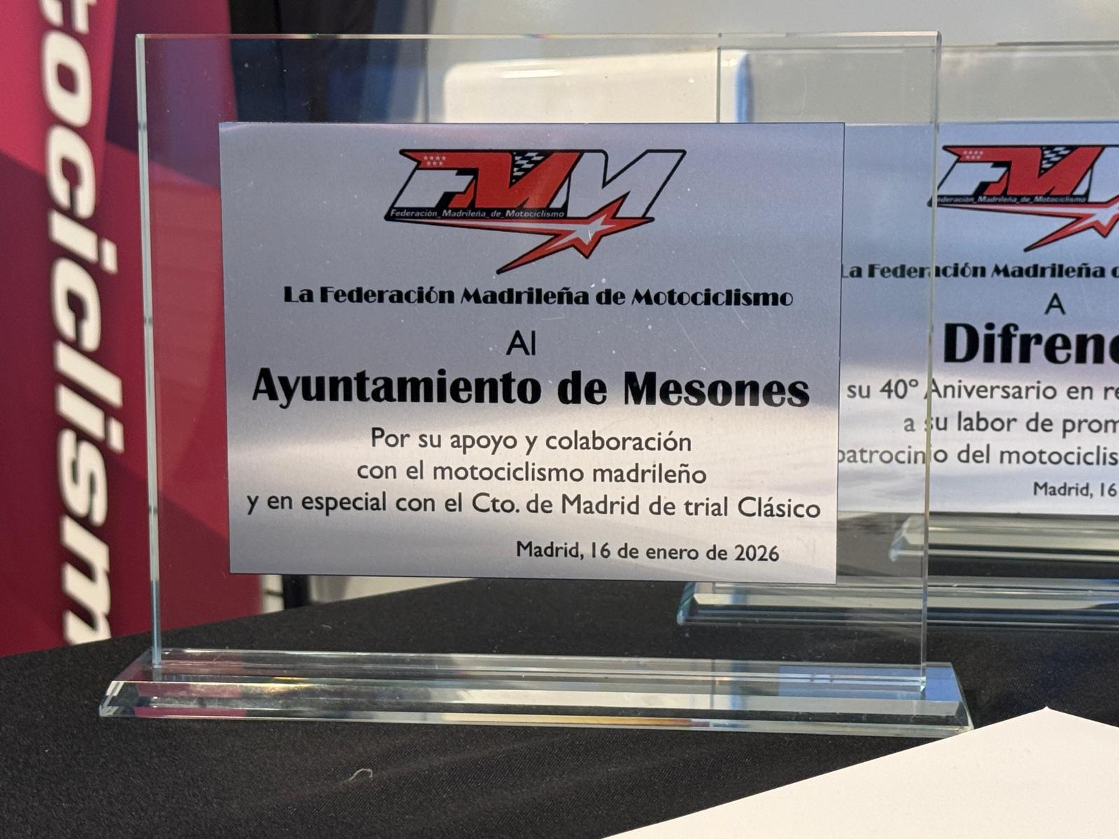 El pasado 16 de enero, el Ayuntamiento de Mesones fue distinguido con la Placa al Mérito Motociclista 2025, un reconocimiento otorgado por la Federación Madrileña de Motociclismo por su apoyo y colaboración con el motociclismo madrileño y, en especial, con el Campeonato de Madrid de Trial Clásico.