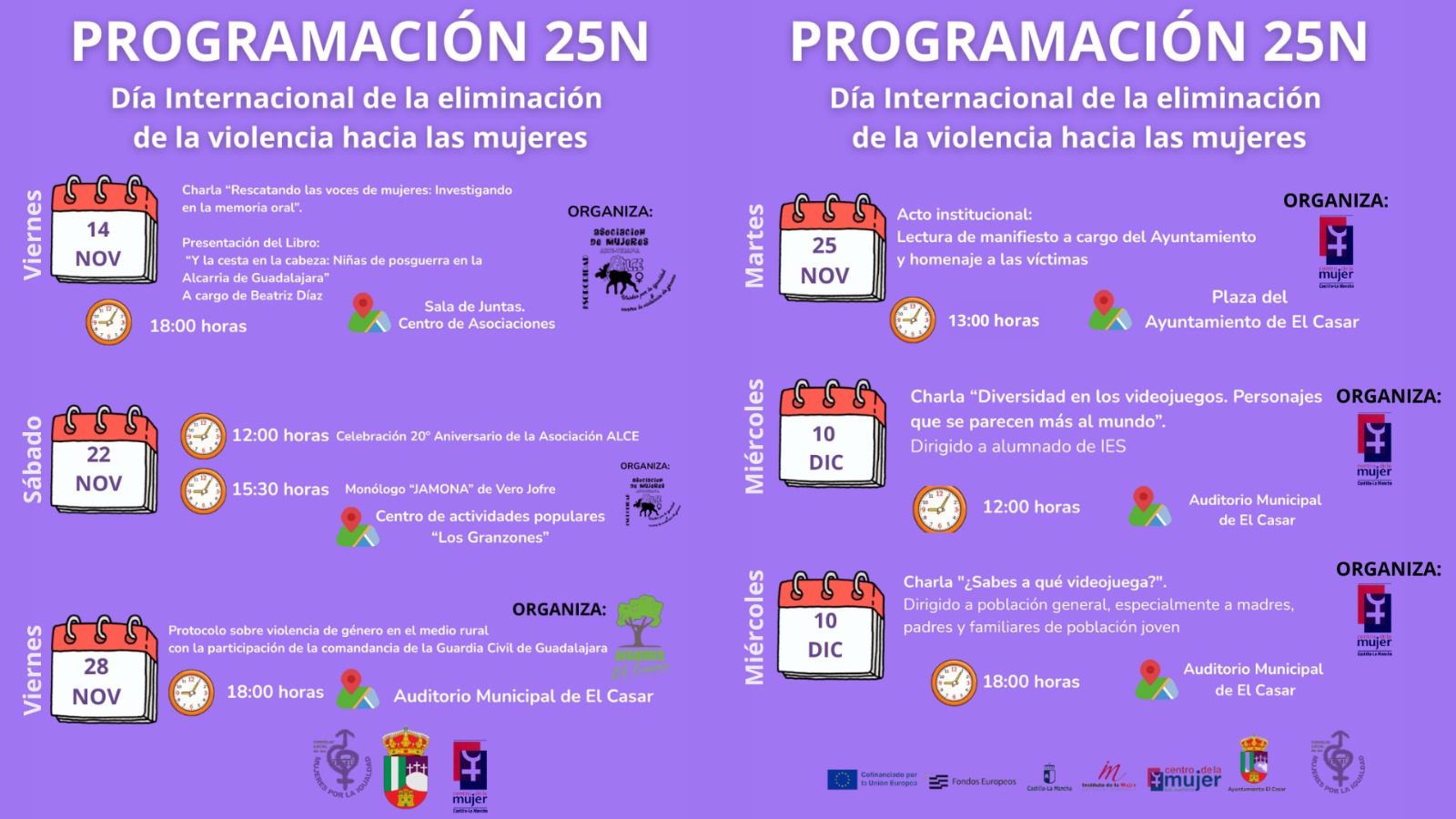 Durante las próximas semanas, la Concejalía de Igualdad y Mujer, el Centro de la Mujer, el Consejo Local de las Mujeres por la Igualdad y las asociaciones de mujeres de El Casar hemos preparado una amplia agenda de actividades para reflexionar, sensibilizar y avanzar hacia una sociedad libre de violencias.