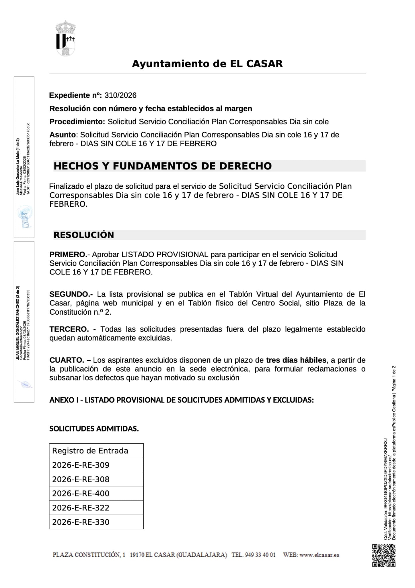 El Ayuntamiento de El Casar informa de la aprobación del listado provisional para participar en el servicio Solicitud Servicio Conciliación Plan Corresponsables Días sin cole, 16 y 17 de febrero de 2026.